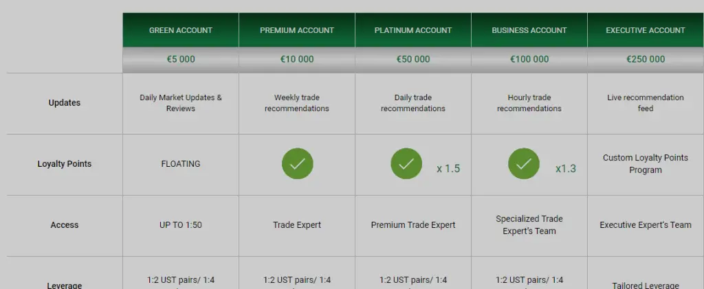What is more, there are different account packages offered by the broker namely, Green, Premium, Platinum, Business and Executive.