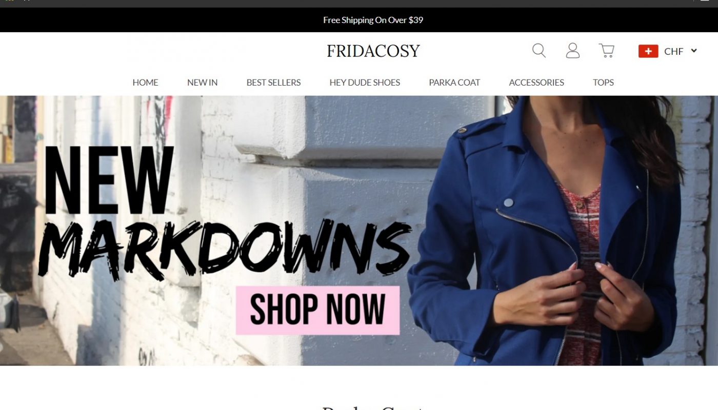 Fridacosy.com is an online store that claims to sell different clothing outfits such as; parka coats, Hey Dude shoes, tops, shorts, etc. The website is not properly structured and it misses some key elements of a professional online store. This site is less than three months old (You can check their age on WHOIS Domain Age Checker), which gives it a low trust score in that respect. Buying things from relatively new websites like that rarely ends well.