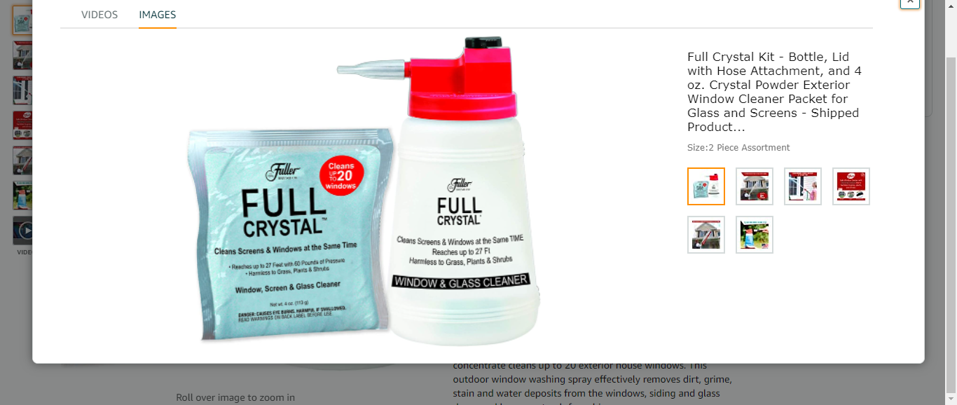 Full Crystal Kit is a hose attachment which allows you to spray a cleaning solution onto your windows up to 27 feet away, without the need for ladders and without having to remove screens first. It also has a window cleaning concentrate which cleans up to 20 exterior house windows. This outdoor window washing spray effectively removes dirt, grime, stain and water deposits from the windows, siding and glass doors and leaves a streak-free shine.