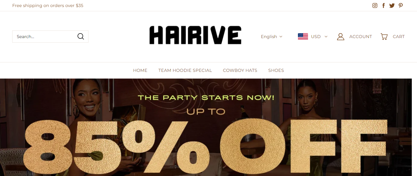 Hairive located at Hairive.com is an online store that is selling various clothing such as hoodies, cowboy hats, shoes, , etc. And these products are sold at a suspicious discount rate.
