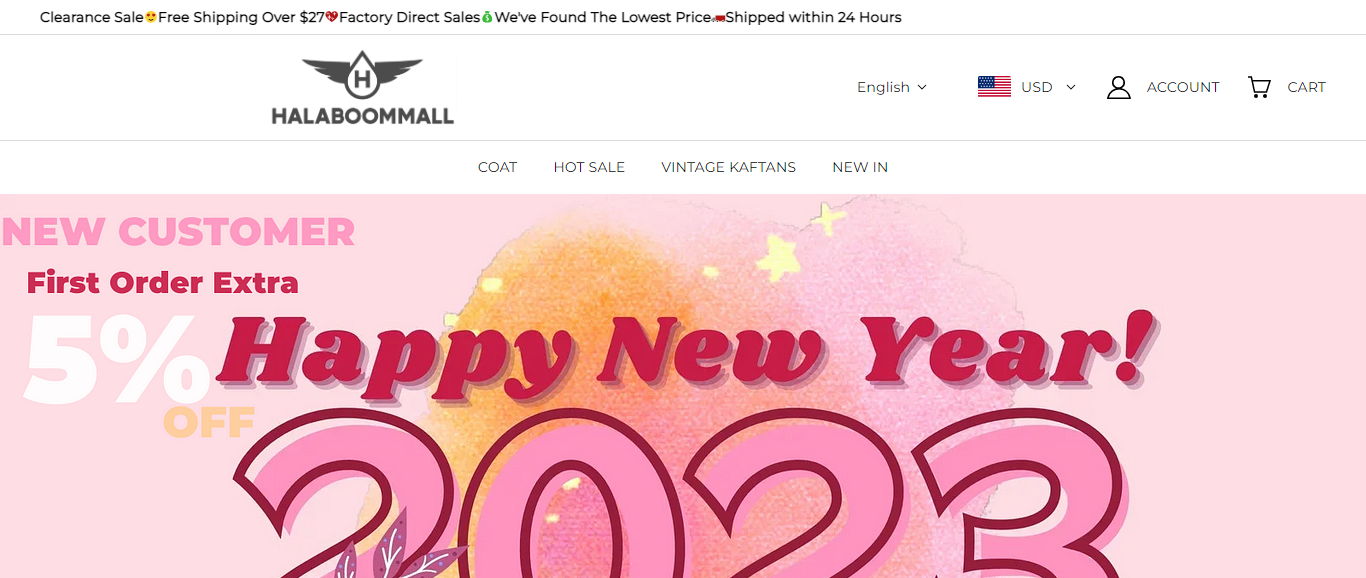 Halaboommall located at Halaboommall.com is an online store that is selling various products such as coats, vintage kaftans, hoodies, beach dress, etc. It is also advertising Amazon unclaimed packages at low prices, And these products are sold at a suspicious discount rate.