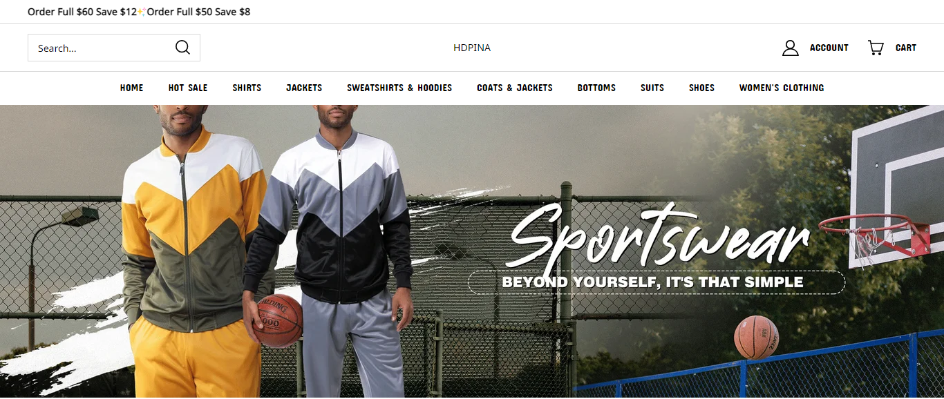 Hdpina located at Hdpina.com is an online store that is selling various products such as shirts, jackets, suits, shoes, hoodies, etc, And these products are sold at a suspicious discount rate.