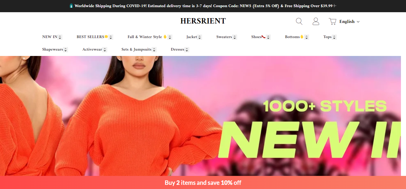 Hersrient located at Hersrient.com is an online store that is selling various products such as boots, coat, sets and jumpsuit, hoodie set, camo sweats, etc And these products are sold at a suspicious discount rate.