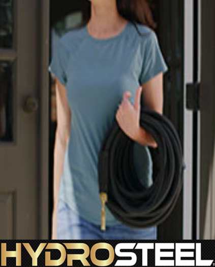 HydroSteel Hose is a garden hose from the Hydro Steel brand. It is a heavy duty hose made from steel. It offers a No kink, No Splits, No bursts Guarantee. It can handle up to six hundred pounds of water pressure per square inch. Due to its three-layer design, it has the power to withstand fire, tires, tight knots and rough handling. The hose is wrapped with a flexible 304-grade stainless steel shield