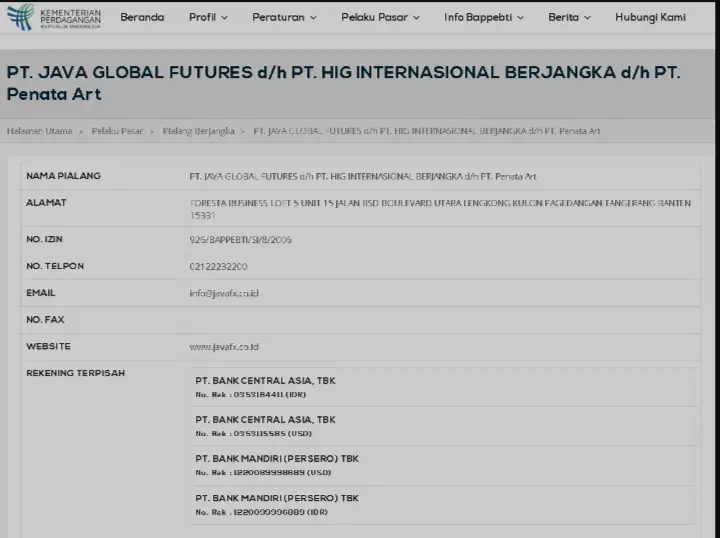 First of, JAVA is an Indonesian broker regulated by the local financial authority the Commodities and Futures Trading Regulatory Agency (BAPPEBTI). In order to clear the doubts, a check of the Indonesian financial regulator BAPPEBTI’s register confirms that PT. Java Global Futures is a licensed broker.