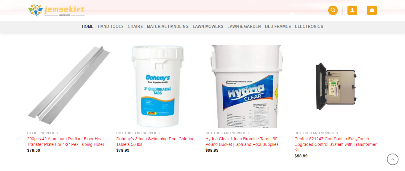 Jemsekirt located at Jemsekirt.com is an online store selling various products such as 200pcs 4ft Aluminum Radiant Floor Heat Transfer Plate For 1/2″ Pex Tubing Hotel, Doheny’s 3 Inch Swimming Pool Chlorine Tablets 50 lbs., Hydria Clear 1 Inch Bromine Tabs | 50 Pound Bucket | Spa and Pool Supplies, Pentair 521247 ComPool to EasyTouch Upgraded Control System with Transformer Kit, Refrigerated Bakery Display Case Countertop 100l Show Case Cabinet Dessert Case, Jacuzzi – JMC16 Multicyclone, Pentair 77707-0016 Manifold Replacement Kit Pool and Spa Heater, Presto 01755 16-Quart Aluminum canner Pressure Cooker, One Size, Silver, Muriatic Acid 2-Pack of 1 Gallon Bottles, Google Pixel 3A XL – 64GB, , etc. And these products are being sold at suspicious discount prices.