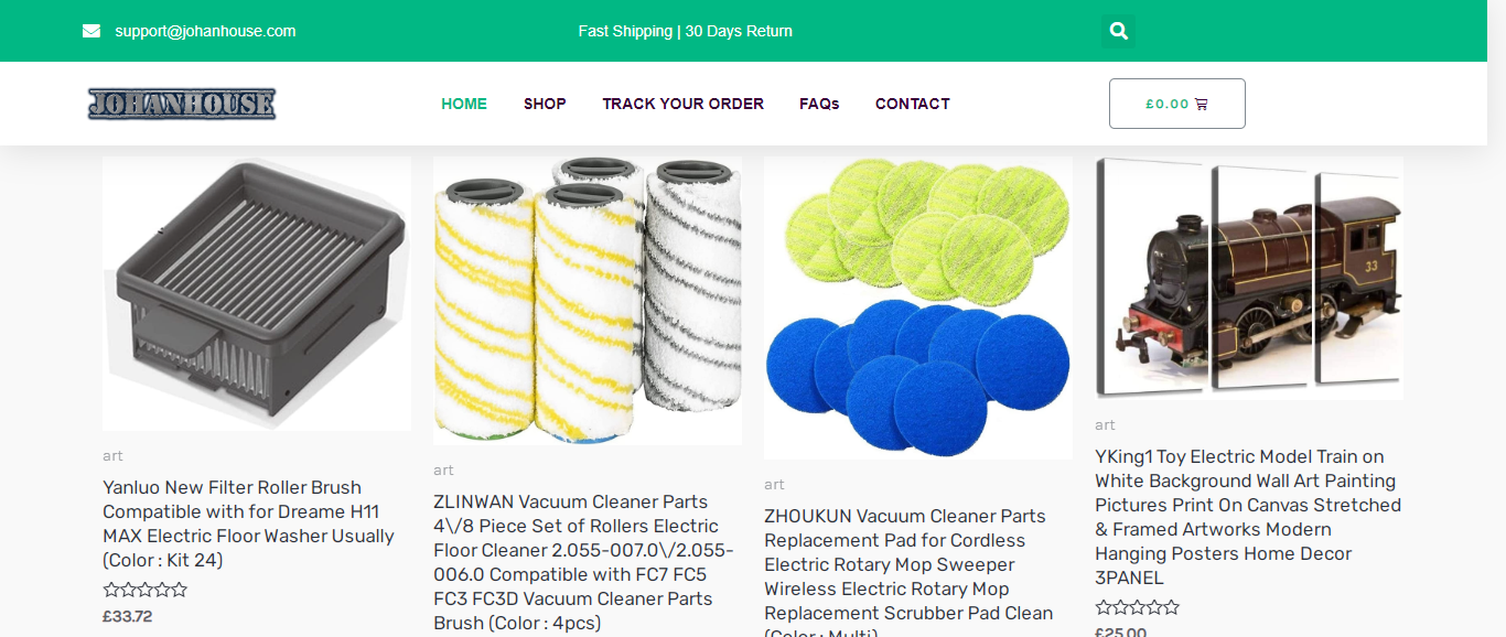 Johanhouse located at Johanhouse.com is an online store selling various products such as new filter roller brush, vacuum cleaner parts, toy electric model train, etc. And these items are being sold at suspicious discount rates.