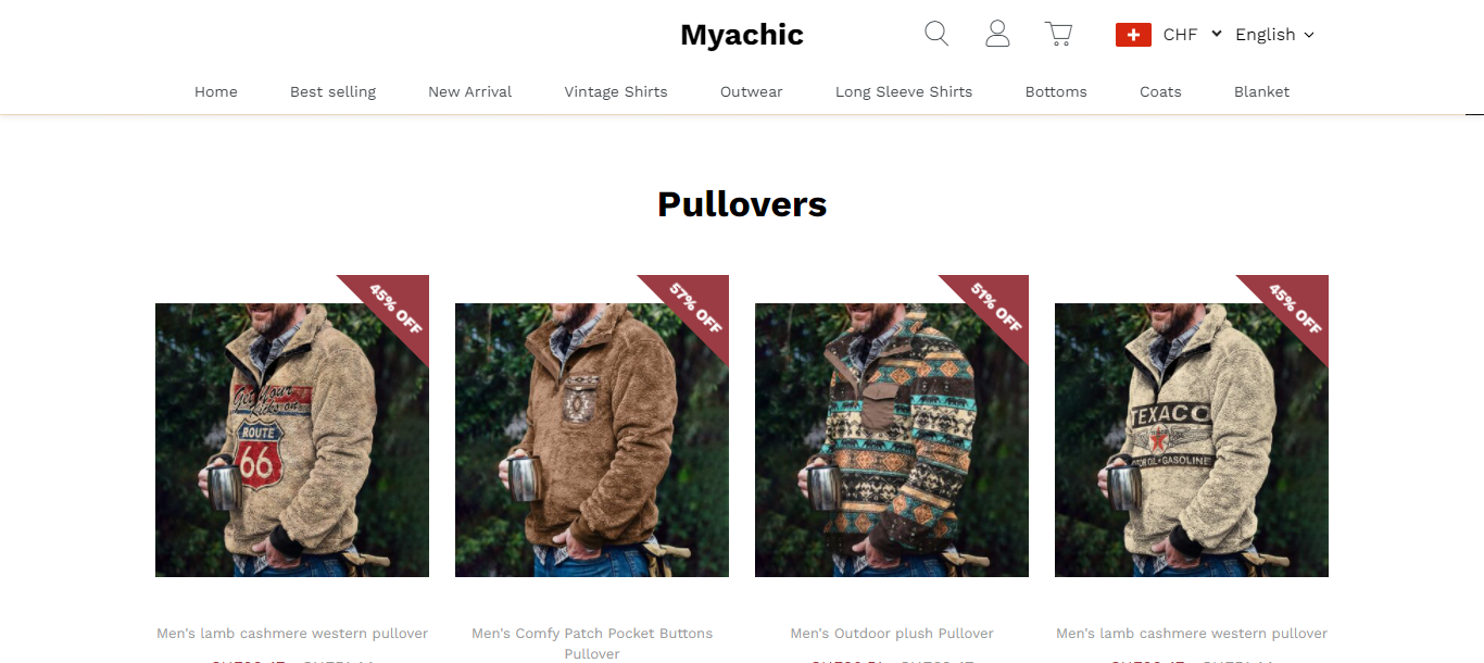 Larschic also known as Myachic located at larschic.com is an online store that deals in various clothing and fashion products such as Mens lamb cashmere western pullover, Mens comfy patch pocket buttons pullover, casual kodiak pullover, Mens alien cat casual print shirt, floral fashion shirt, etc . And these products are being sold at suspicious discount prices.