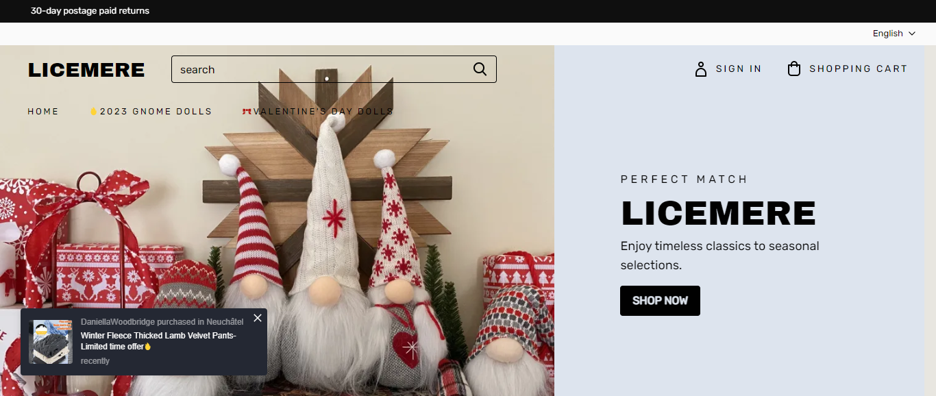Licemere located at Licemere.com is an online store that is selling various dolls. The website is enticing customers with low prices, pretending to be selling Wendy’s Gnome Dolls that cost $35 for only $16.