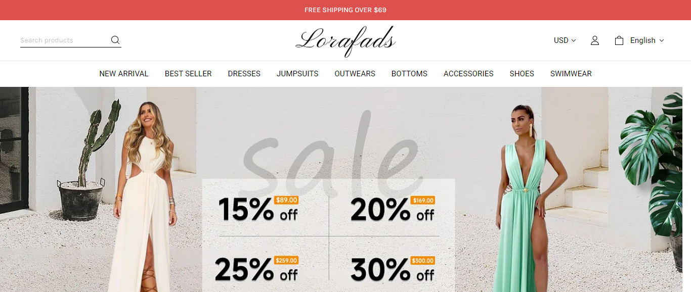 Lorafads located at Lorafads.com is an online store that is selling various products such as dresses, jumpsuits, etc. And these products are sold at a suspicious discount rate.