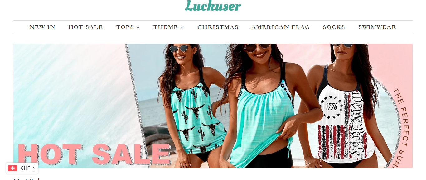 Luckuser located at Luckuser.com is an online store selling fashion and clothing products such as tees, tanks, sweatshirts, socks, swimwear, etc. And these products are being sold at suspicious discount prices.
