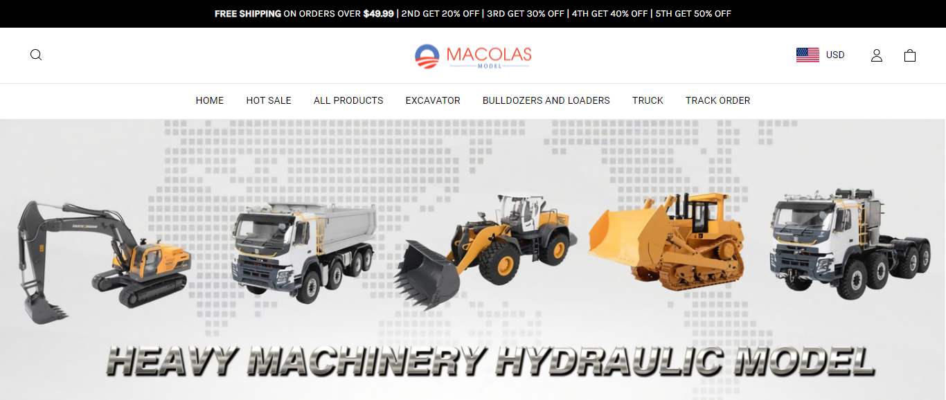 Macolas located at macolas.com is an online store that is selling Mini excavator, 1/14 FRONT SHOVEL RC HYDRAULIC EXCAVATOR, 1/14 Carter C374 Heavy Excavator BA-B0001 Model, 1/14 RC HYDRAULIC WHEEL LOADER, 1/14 ARMAGEDDON FMX RC HYDRAULIC DUMP TRUCK 8X8, 1/14 Truck MAN (TGS) 8X8 Hydraulic U Bucket Dump Truck Model, RD-A0004 1/16 Hydraulic AOUE AT60H Articulated Truck Model, 1/14 HYDRAULIC TRACKED SKID STEER LOADER, 8X8 tonnage heavy truck, Mine truck model, 1/14 SCORPION RC HYDRAULIC FORKLIFT, AC45 city crane IMC 1:50 scale model, 4 card transport crane-IMC1:50 scale model, etc. And these products are being sold at suspicious discount prices.