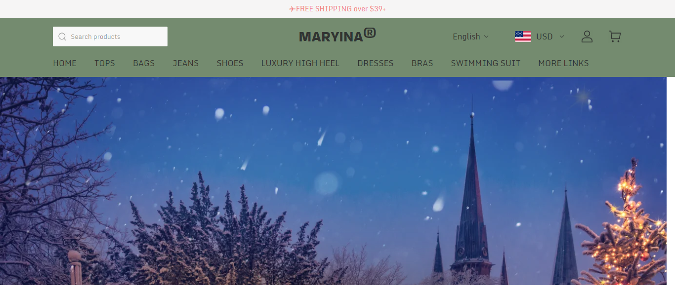 Maryina located at Maryina.com is an online store that is selling various types of products such as tops, bags, bras, jeans, dresses, etc. And these products are sold at a suspicious discount rate.