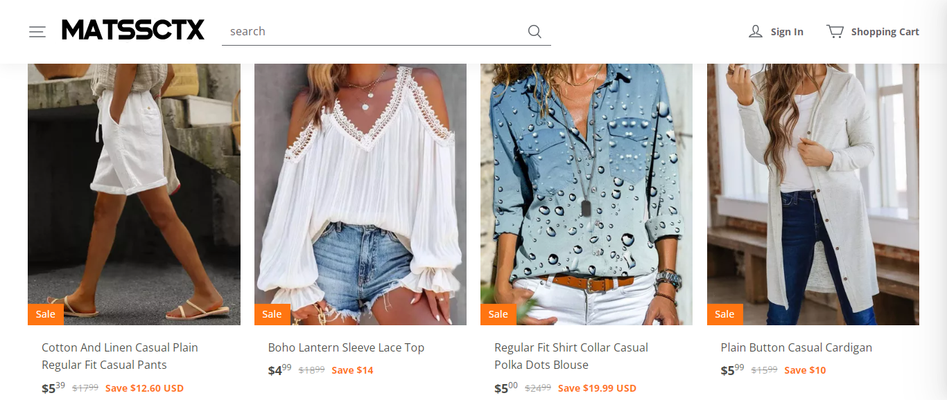 Matssctx located at Matssctx.com is an online store that is selling various products such as tops, pants, blouse, cardigan, etc. And these products are sold at a suspicious discount rate.