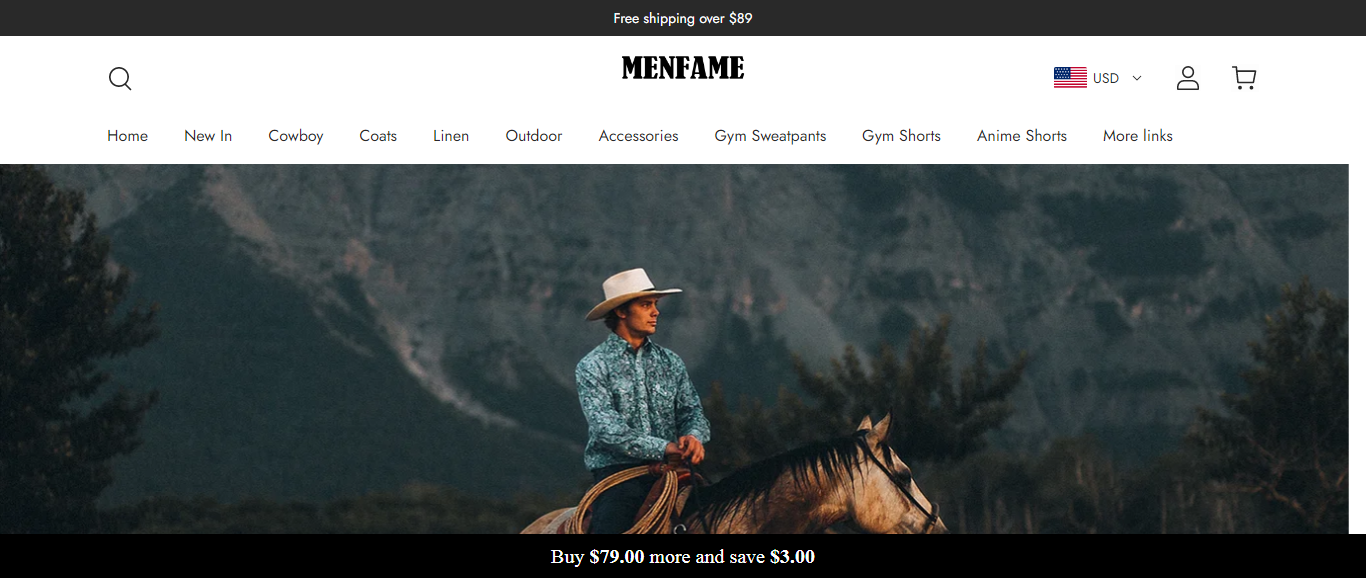 Menfame located at Menfame.com is an online store that is selling various products such as coats, sweatpants, gym shorts, etc. And these products are sold at a suspicious discount rate.