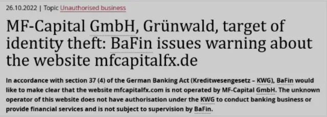 First of, MFCapitalFX.com has no financial authority overseeing its financial services. As far as we’re concerned, this is the one of the most ambiguous yet common remarks made by scammer entities. Here, Germany’s financial regulator, BaFin has issued a warning against this false broker. See the warning down below: