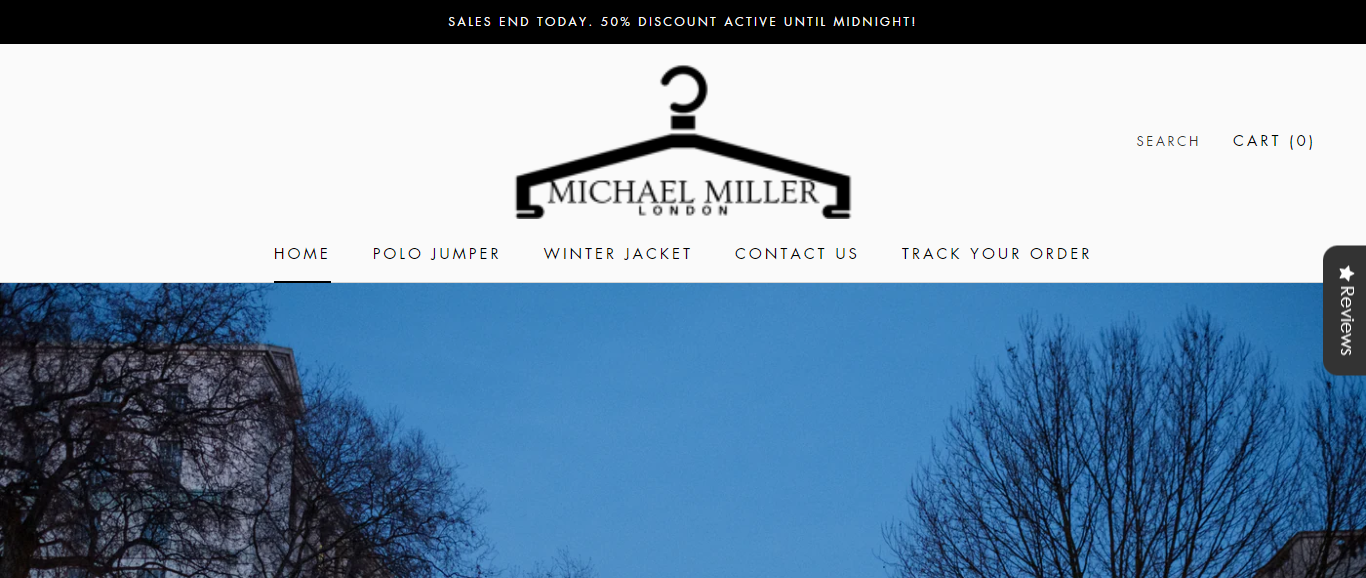 Michael Miller London located at Michaelmillerlondon.com is an online store that is impersonating the Michael Miller brand. It claims to be selling various products such as winter jackets, polo jumper, etc. at suspicious discount prices etc.