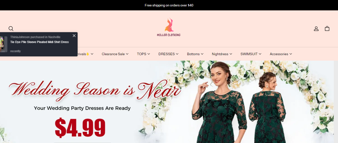 Millerclothing located at millerclothing.com is an online store that is selling various products such as dress, pants, Tshirt, , etc And these products are sold at a suspicious discount rate.