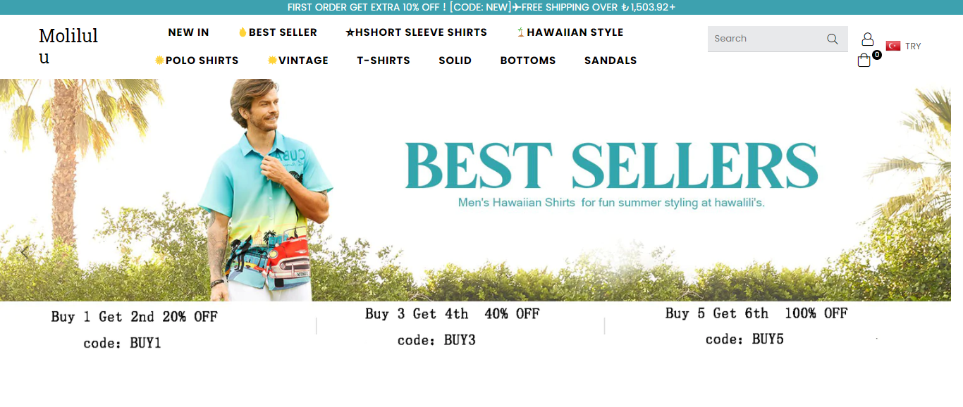 Molilulu located at Molilulu.com is an online store selling various male fashion such as vintage shirt, casual shirts, sandals,etc. And these items are being sold at suspicious discount rates.