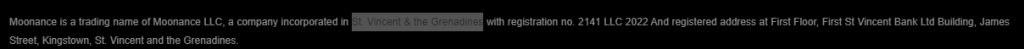First of, Moonance.com claims to hold regulation and incorporation of St. Vincent & the Grenadines.