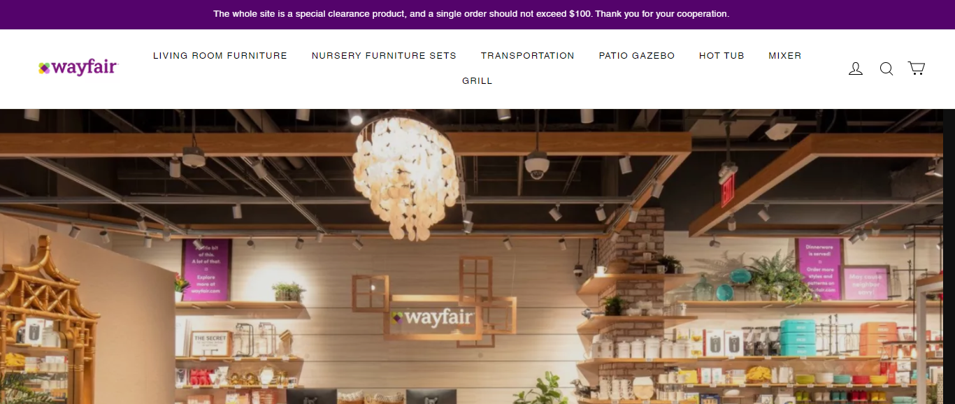 Mureshoping located at Mureshoping.com is an online store that is impersonating the Wayfair brand by using its brand name and logo as its own. It claims to be selling various products such as living room furniture, nursery furniture sets, etc. And these items are being sold at suspicious discount rates.
