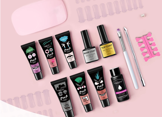 - The kit consists of a nail gel tube, bottom coat, top coat, UV light LED nail clamp, slip solution, nail forms, cuticle pusher, nail brush, nail file, finger separator, and finger clamp.