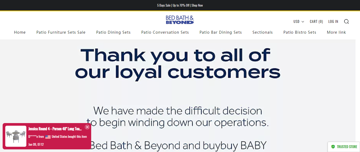 Netsheep located at Netsheep.shop that is impersonating the Bed Bath and Beyond brand. It claims to be selling various products such as patio conversation sets, patio bar dining sets, patio furniture sets, etc. And these products are sold at a suspicious discount rate.