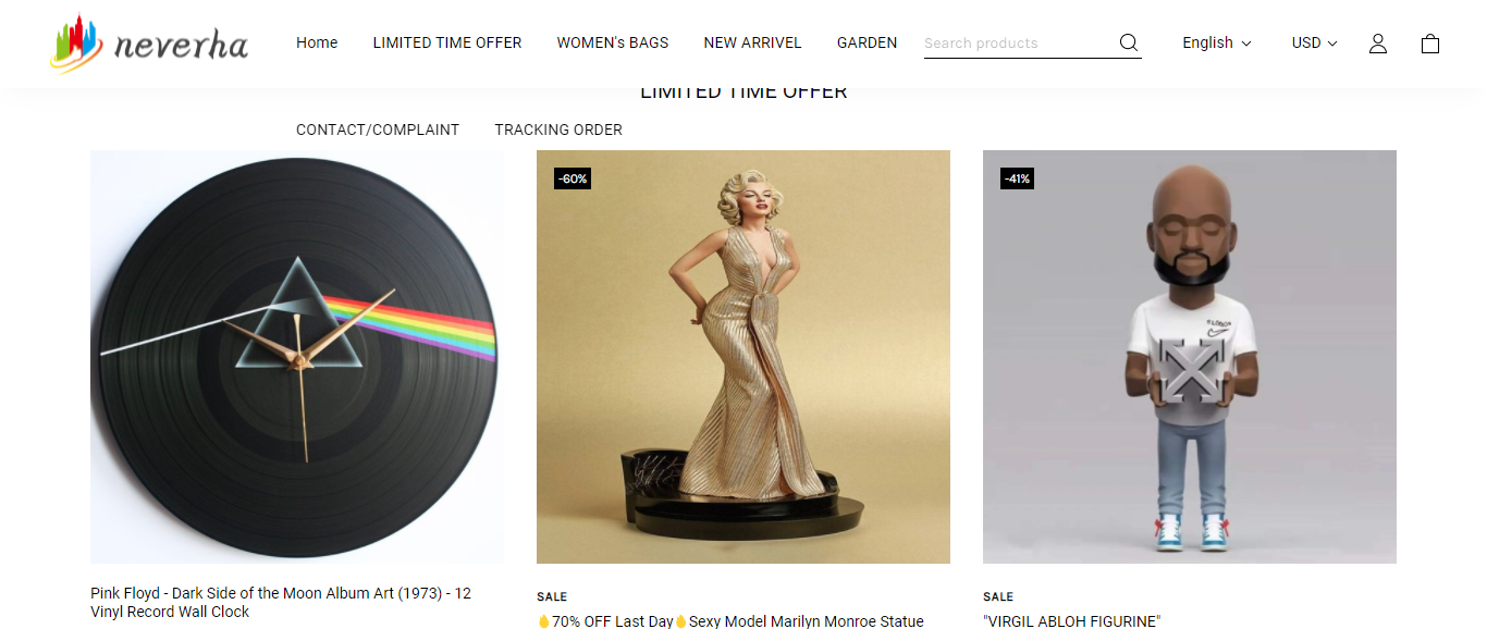Neverha located at Neverha.com is an online store selling various products such as Home Decor Springs Series Best New Year Gifts, Suncatcher stained glass birds modern home decor, Stained glass hummingbird , Modern stained glass window hangings decor, Division Bell Pink Floyd Sculpture Heads, . Hotel Continental Coin. John Wick coin, Women’s bags, 100 LED Star String Holiday Light, Pack of Christmas Cards, Xmas Card Multipack, Fun & Cute Christmas Card Bundle, Holiday Cards, Festive Cards etc. And these products are being sold at suspicious discount prices.