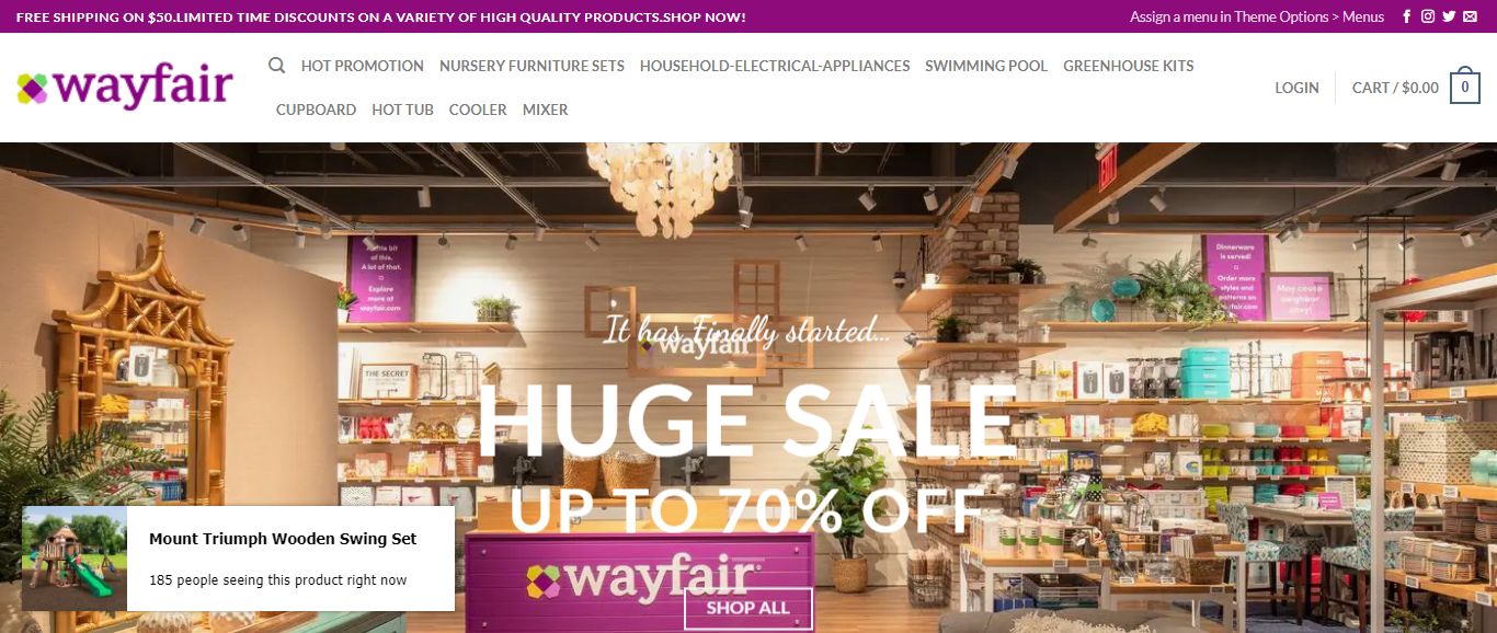 Omnicheese located at Omnicheese.com is an online store that is impersonating the Wayfair Brand by using its brand name and logo on its site as its own. It claims to be selling various products such as nursery furniture sets, swimming pool, household electrical appliances, greenhouse kits, cupboard hottub, cooler, mixer,etc. And these products are sold at a suspicious discount rate.