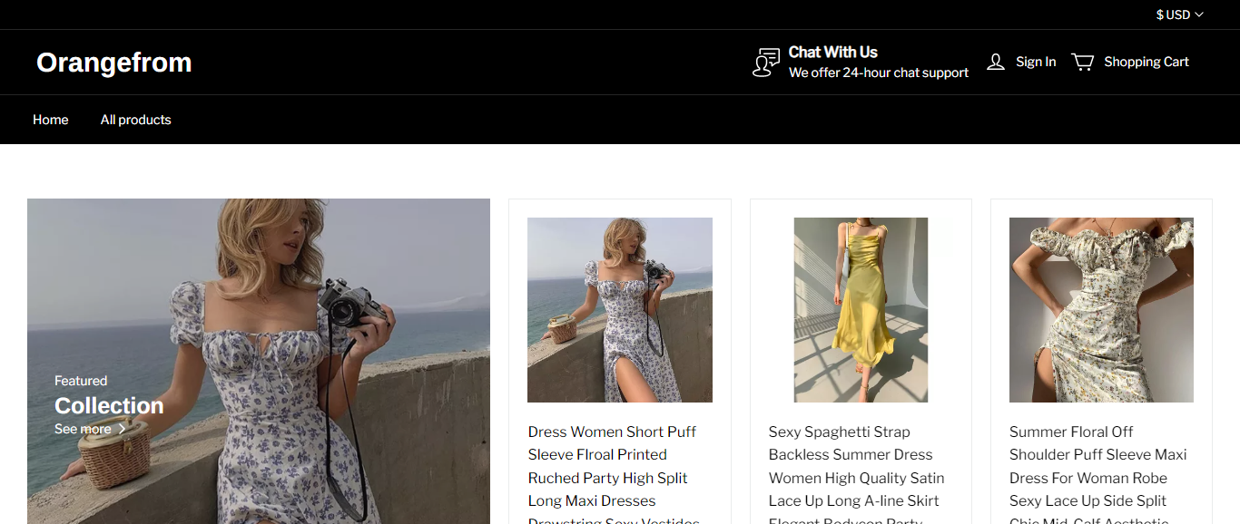 Orangefrom located at Orangefrom.com is an online store that is selling various products such as maxi dress, summer dress, tops, jeans, etc And these products are sold at a suspicious discount rate.
