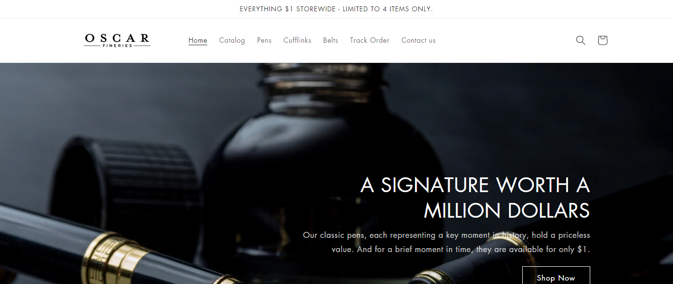 Oscar fineries located at Oscarfineries.com is an online store that is selling various types of products such as pen, belts, cufflinks, etc. And these products are being sold at suspicious discount prices.