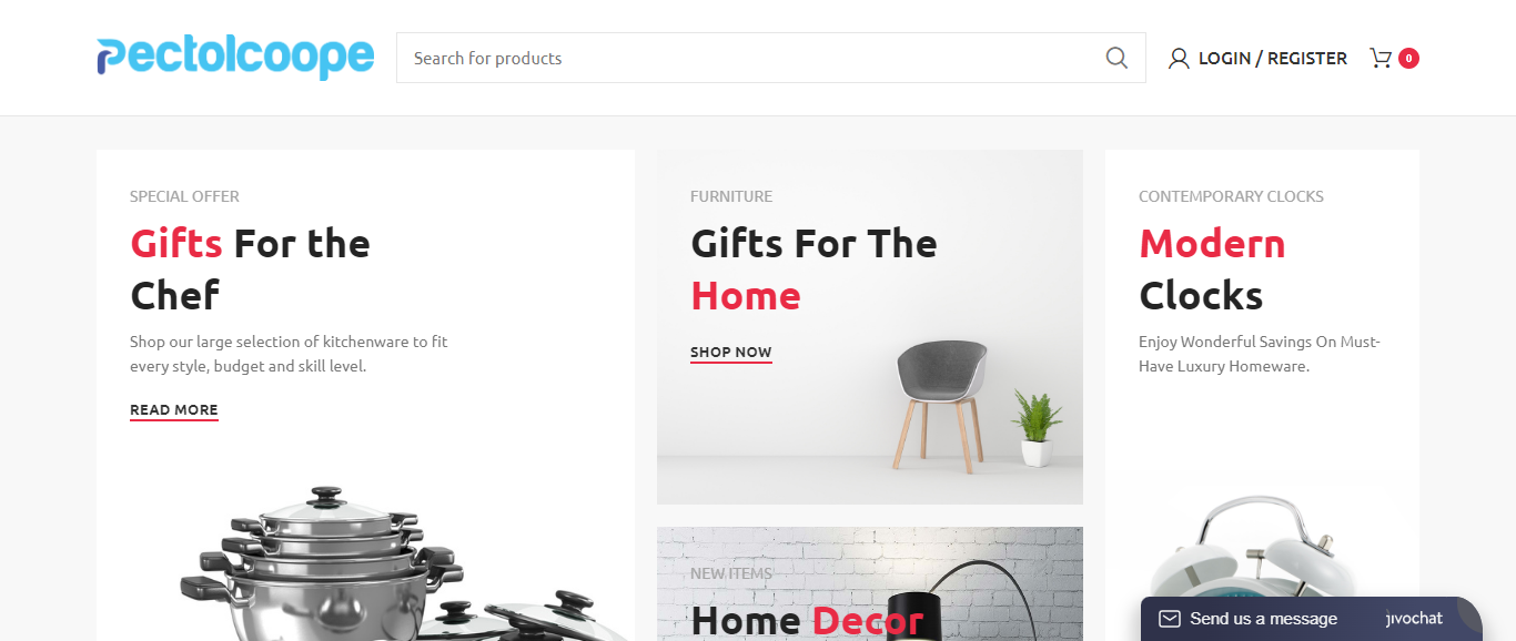 Pectolcoope located at Pectolcoope.com is an online store that is selling various products such as home decor, modern clocks, tire, kitchen appliances, etc. And these products are sold at a suspicious discount rate.