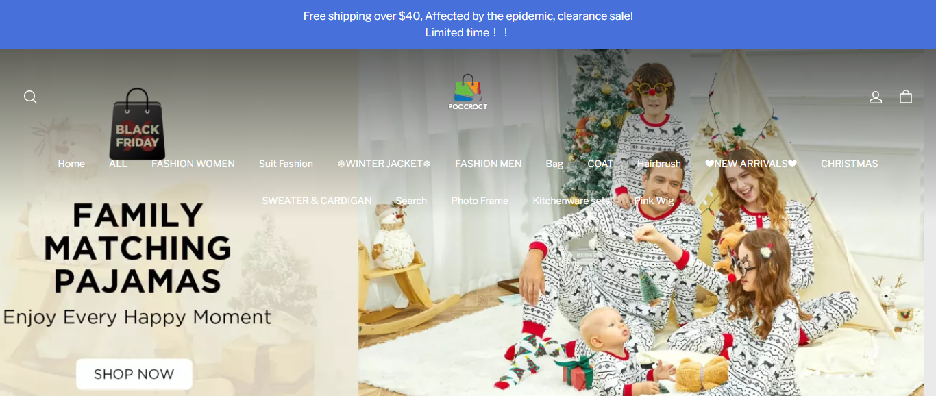 Poocroct located at Poocroct.com is an online store that is selling various types of products such as Family Christmas Pajamas, winter jacket, hair brush, cooking utensils, etc. And these products are sold at a suspicious discount rate.