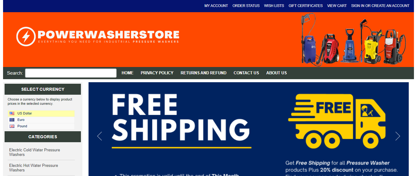 Powerwasherstore located at Powerwasherstore.com is an online store that is selling various all kind of power cleaning products or equipment such as Cold-Water, Hot-Water, Cold-Gas, Hot-Gas Presure Washer, Accessories, etc. And these products are being sold at suspicious discount prices.