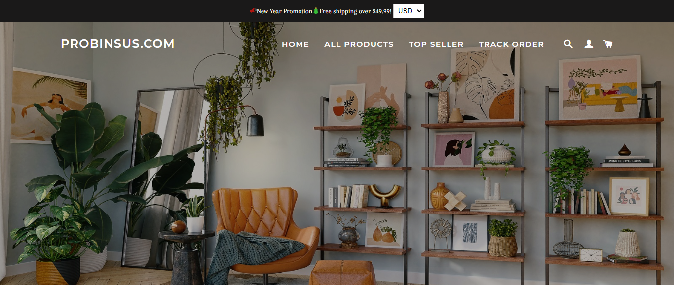 Probinsus located at Probinsus.com is an online store that is selling various furniture such as fireplace TV Cabinet, bedroom dresser with drawers, kitchen storage cabinet, etc. And these products are sold at a suspicious discount rate.