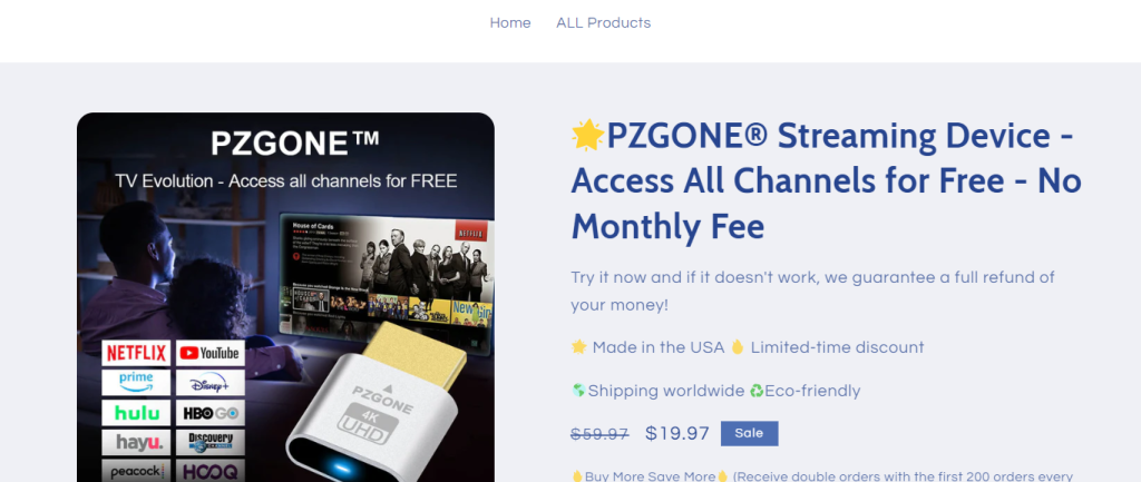 The PZGONE scam uses viral social media ads and websites with impossible claims of accessing all TV channels for free to promote $5 streaming sticks from China at insane 1000%+ markups as incredible cable streaming devices.