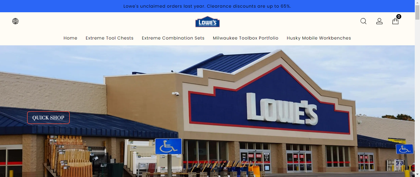 Qdknv located at Qdknv.com is an online store that is impersonating the Lowe’s brand by using its brand name and logo as its own. It claims to be selling various products such as extreme tool chests, husky mobile work benches, milwaukee toolbox portfolio, etc. And these items are being sold at suspicious discount rates.