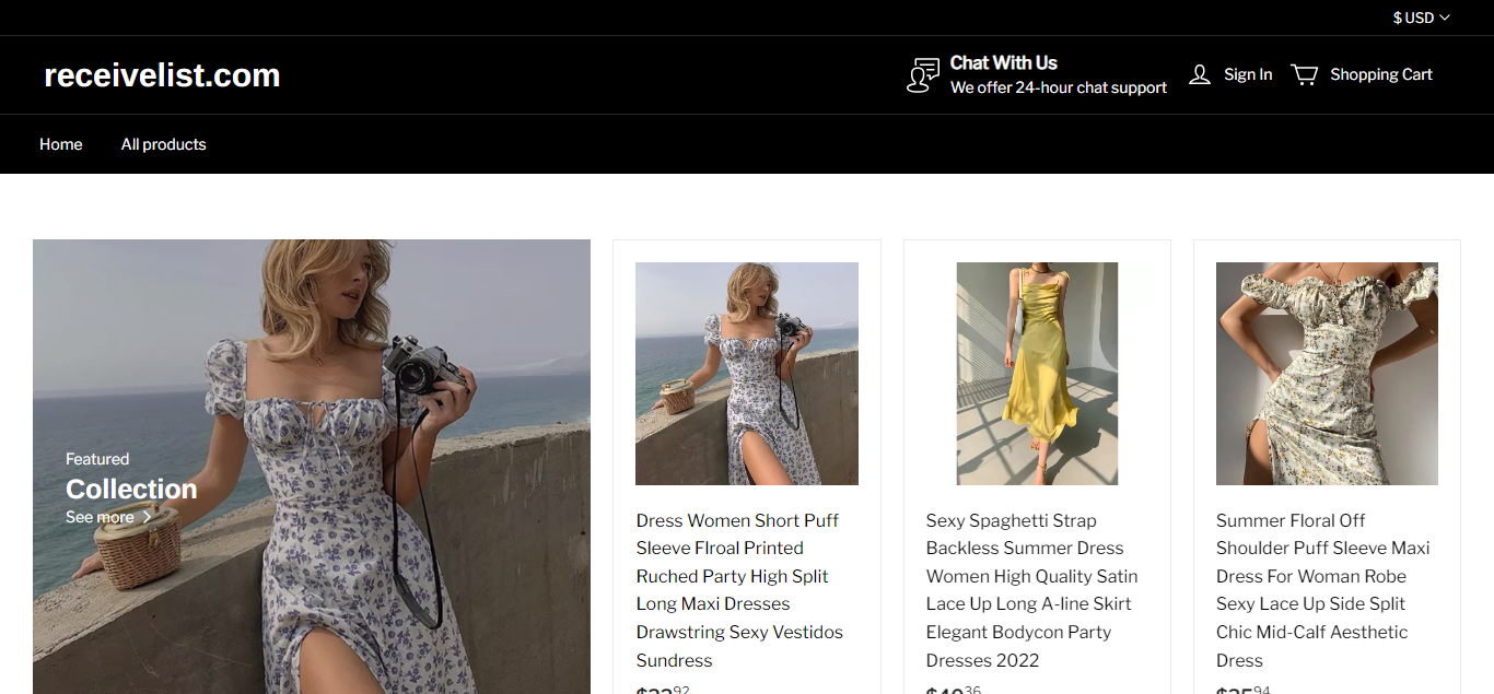 Receivelist located at Receivelist.com is an online store that claims to sell Amazon Pallets for only $34.97. It is also selling various types of clothings such as dresses, sandals, etc. And these products are sold at a suspicious discount rate.