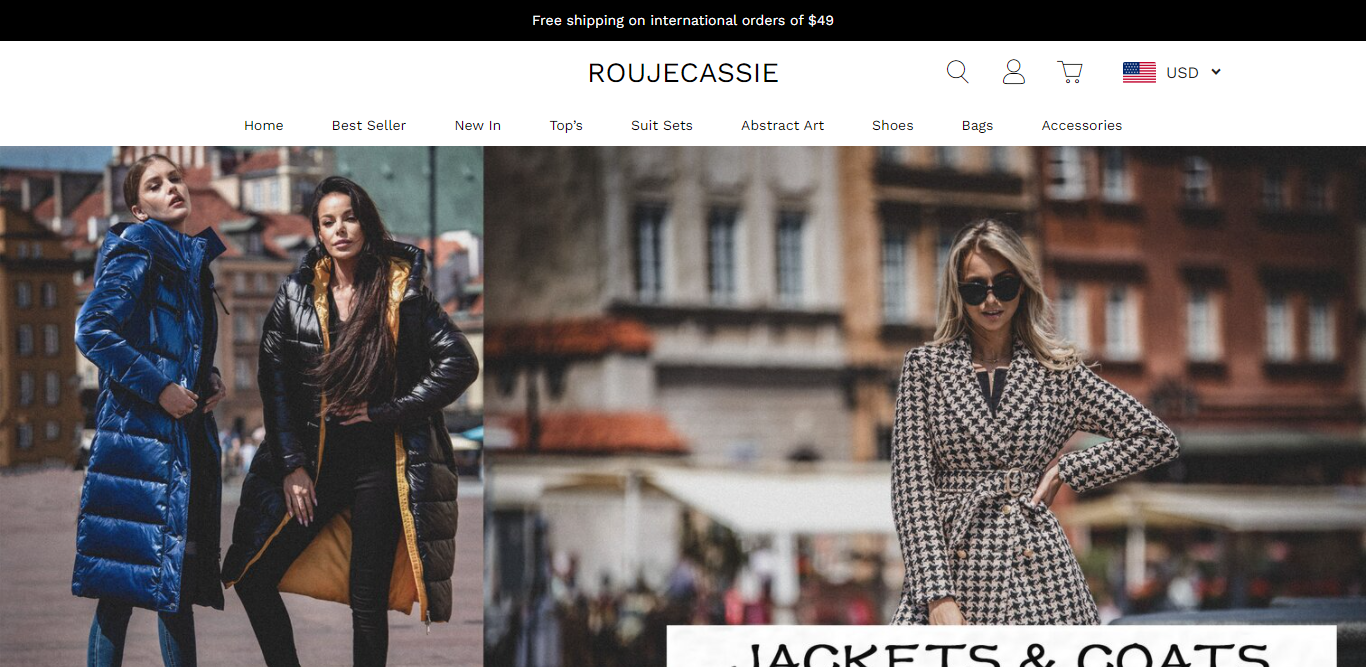 Roujecassie located at roujecassie.com is an online store that deals in various types of clothing and fashion products such as tops, suit sets, shoes, bags, accessories, jackets, etc. And these products are being sold at suspicious discount prices.