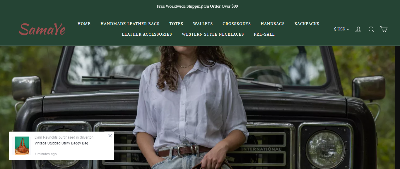 Samaye located at Samaye.co is an online store that is selling various types of handmade leather bags, totes, wallets, handbags, , And these products are sold at a suspicious discount rate.