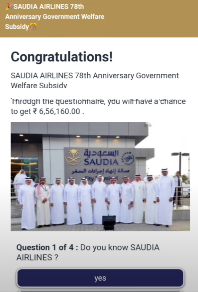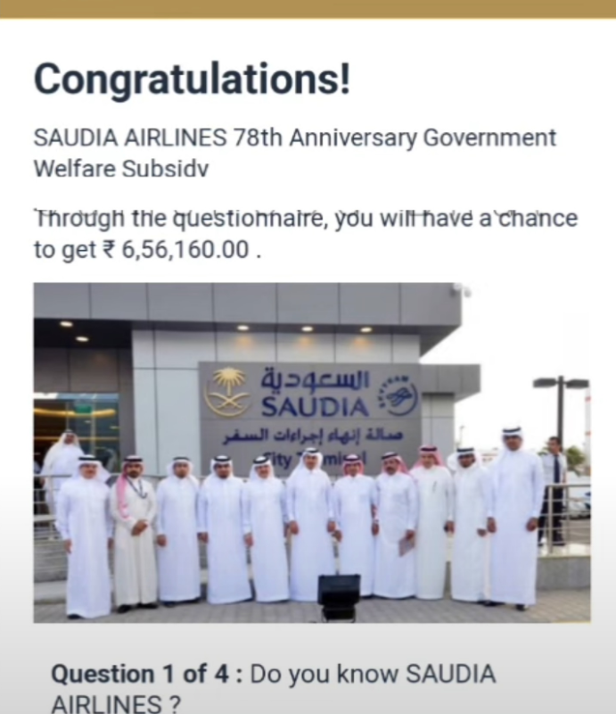 Saudi Airlines 78th Anniversary Scam Facebook Post are scam posts claiming to be from Saudi Airlines saying they giving away free money to celebrate its 78th anniversary through a government welfare subsidy and asking you to fill a questionnaire.