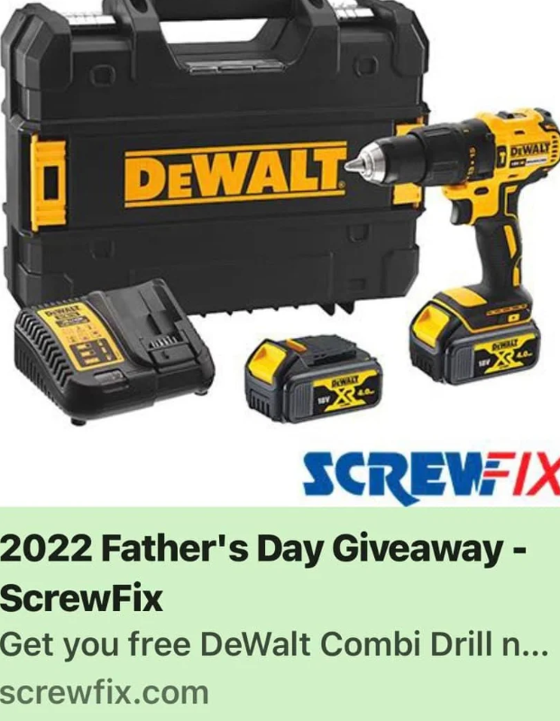 Screwfix Dewalt Giveaway WhatsApp Scam are scam posts circulating on Whatsapp and claiming to be from Dewalt, they claim that you have won Free Dewalt Combi Drill For your dad on Fathers day, with a link to a phishing website.