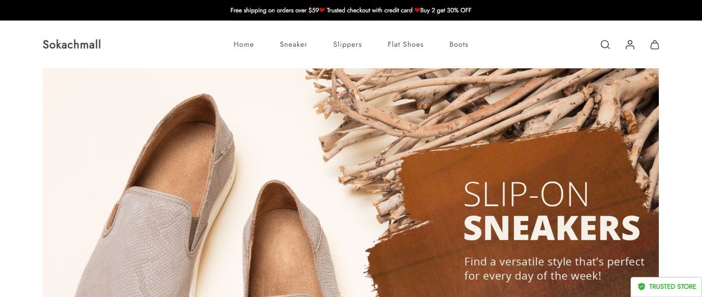 Sokachmall located at Sokachmall.com is an online store that is selling various products such as flat shoes, sneakers, slippers, boots, etc. And these products are sold at a suspicious discount rate.