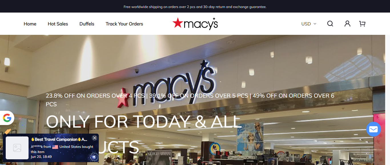Supertravelplanet located at Supertravelplanet.com is an online store that is impersonating the Macy ‘s brand by using its brand name and logo. It claims to be selling various luggage’s, etc And these products are sold at a suspicious discount rate.