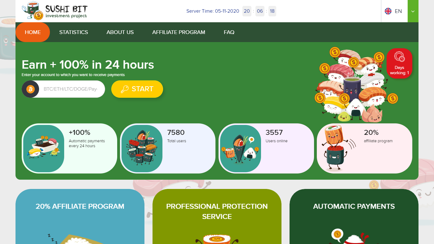 Just like every HYIP out there, the life span of this so called investment platform is very short. It is true that there are legitimate investment platforms; Sushibit.cc IS NOT ONE OF THEM!