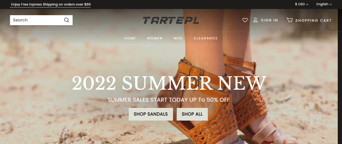 Tartepl located at Tartepl.com is an online store that is selling various types of shoes, boots, etc And these products are sold at a suspicious discount rate.