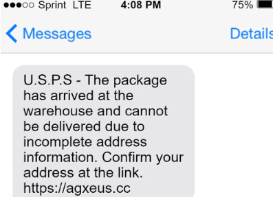The scam text is been sent by scammers with a link to a phishing website agxeus.cc. The scam text message claims that they’ve been unable to deliver your package because your shipping address is incomplete, it then asks you to click on the link on the link in the text so you can confirm your address. However this is a scam text which scammers are sending.