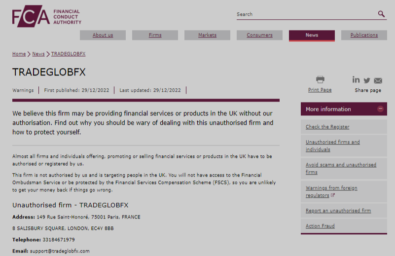 Investigating further, the Financial Conduct Authority of the UK has blacklisted TradeGlobFx as an unreliable company that is not authorized to provide financial services in the country. Take a look-