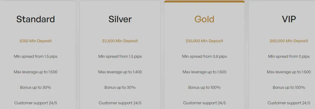 What is more, there are different account packages offered by the platform namely, Standard, Silver, Gold and VIP.