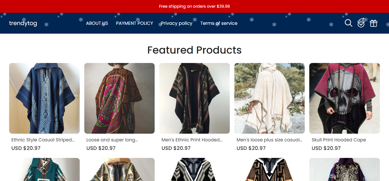 Trendytog located at Trendytog.com is an online store that is selling various products such as hooded cape, cloak , etc. And these products are sold at a suspicious discount rate.